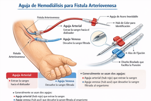 La aguja de hemodiálisis para fístula arteriovenosa es un dispositivo médico estéril y de un solo uso diseñado para permitir el acceso seguro al torrente sanguíneo durante la terapia. Se utiliza para puncionar la fístula —una conexión quirúrgica entre una arteria y una vena— y así facilitar la circulación de la sangre hacia el dializador y su posterior retorno al paciente.